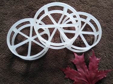 塑料扁環(huan)的高徑比為0.2-0.4,取消了階梯環的翻(fan)邊,采用內(nei)彎(wan)弧(hu)形筋片來提高填料強度,在(zai)亂(luan)堆時能(neng)有(you)序排列,流道結(jie)構(gou)合理,壓降低,在(zai)處理能(neng)力和傳(chuan)質(zhi)性能(neng)上均有(you)所改(gai)善。