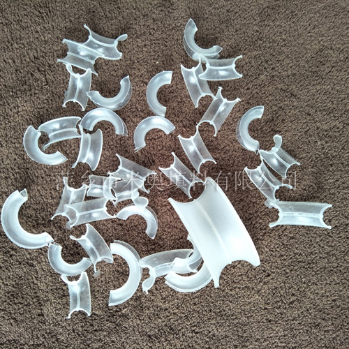 矩鞍環是對弧鞍形的改進,其主要區別在于將一對弧形面改為矩形面,且內外曲率半徑不同,從而避免了容易疊套的缺點,使床層孔隙率均勻,改善了液體分布性能與拉西環或弧鞍形環相比,矩鞍形液體分布性能與拉西環或弧鞍形環相比,塑料矩鞍環具有平滑弧形側面在填料床層內,增加了填料間接觸的空隙,使之更有利于氣體和液體在填料層中的流動和擴散,具有其液泛點高壓降低,傳質效率高等特點。